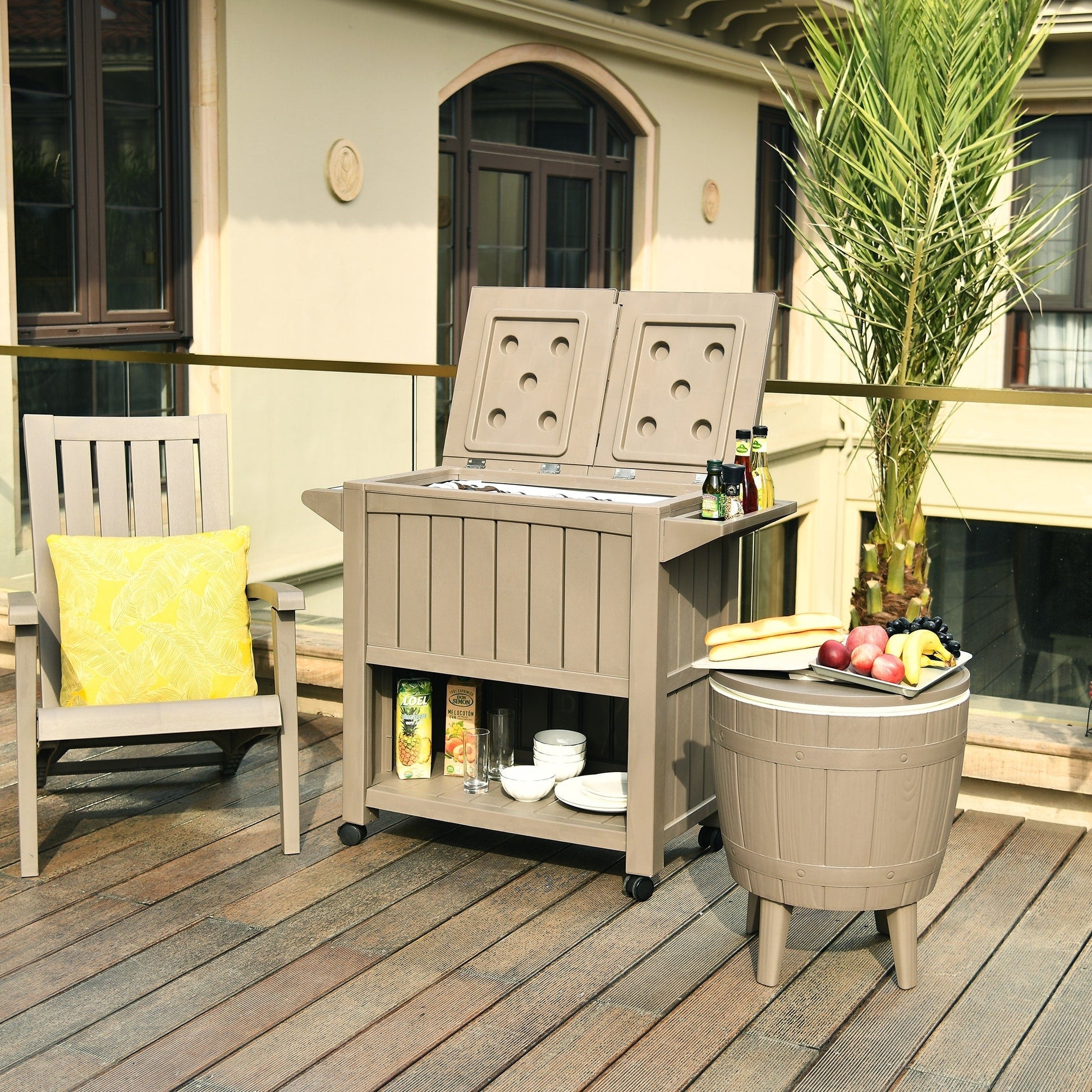 LARGE CAPACITY- This patio cooler cart comes with an 85 qt/21 gallon ice bucket and open storage to chill your beverages for hours.MULTIFUNCTIONAL ACCESSORIES- Features versatile distinct designs including bottle opener, matching trash can, spice rack, and bottom storage space for convenience, as well as the PVC ice bag with drain holes to easily replace water or ice cubes.LOCKING CASTERS- The rolling cooler ice chest enjoys 4 multi-directional rollers, 2 of which are lockable to hold the cooler in place for extra stability on uneven surfaces.QUICK ASSEMBLY- This outdoor beverage cart is made from recyclable and durable resin for easy maintenance; Simply follow the included instructions for an easy installation.PREMIUM MATERIALS- Our Rolling Cooler Carts are built using all-weather resistant resin featuring natural wooden texture for great durability, protection against peeling and denting, a sleek look, and minimal touch.