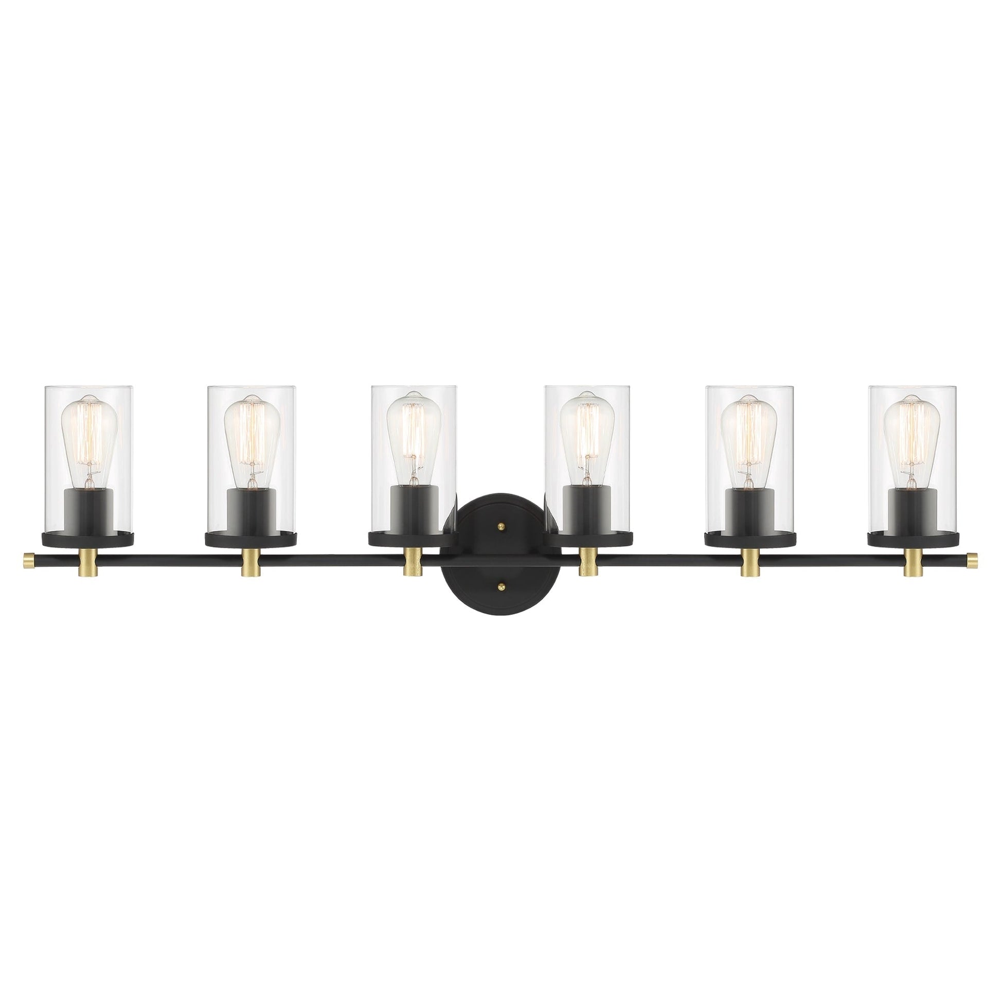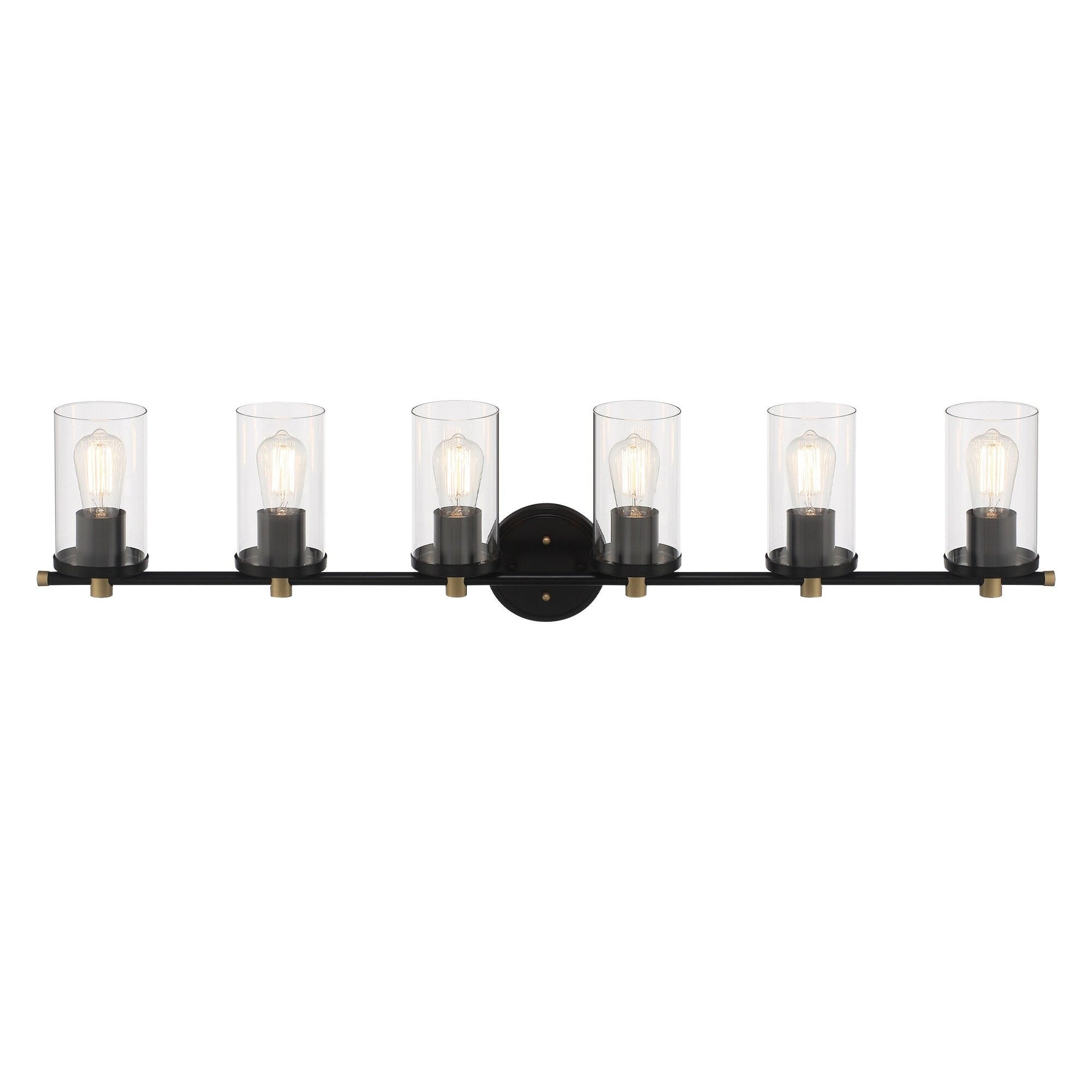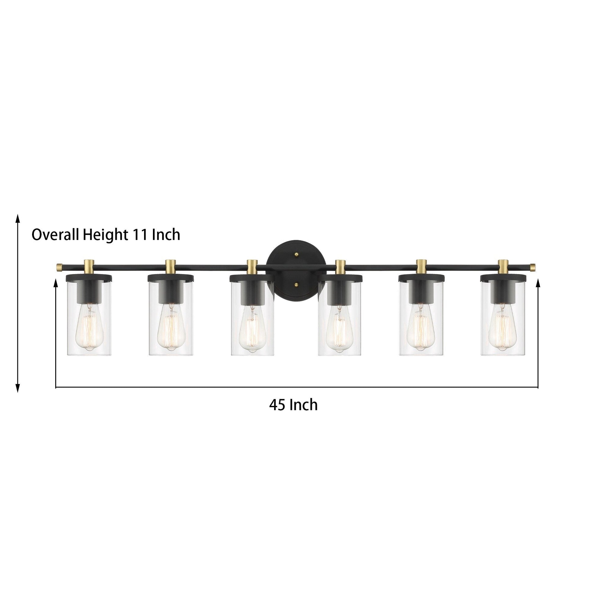 Add a touch of modern farmhouse to your bathroom with the 6-light Vanity Light. Made of premium quality steel and hand-blown glass, features damp UL listed to ensure safety and durable. Black in finish decorated with brass in some detail, this bathroom light fixture is perfect for modern, transitional, and farmhouse styles. 6 lights designed can illuminate a large space as bath, entryway, and kitchen.