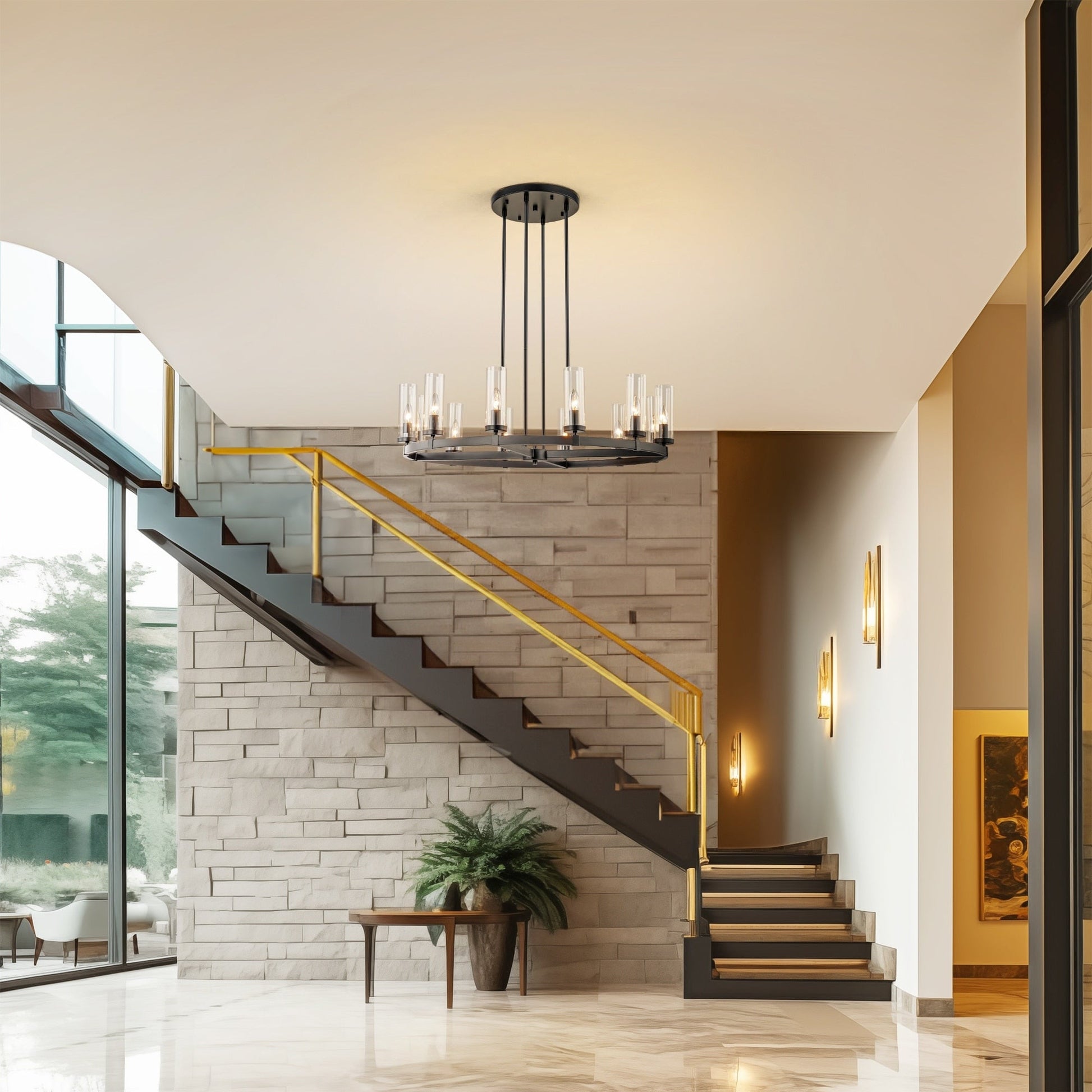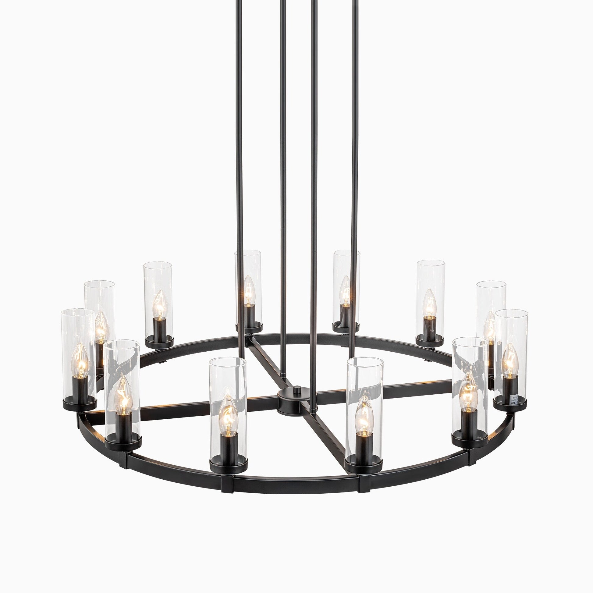 12-Light Mid-Century Modern Cylinder Clear Glass Wagon Wheel Chandelier Gold/Black Large Chandelier