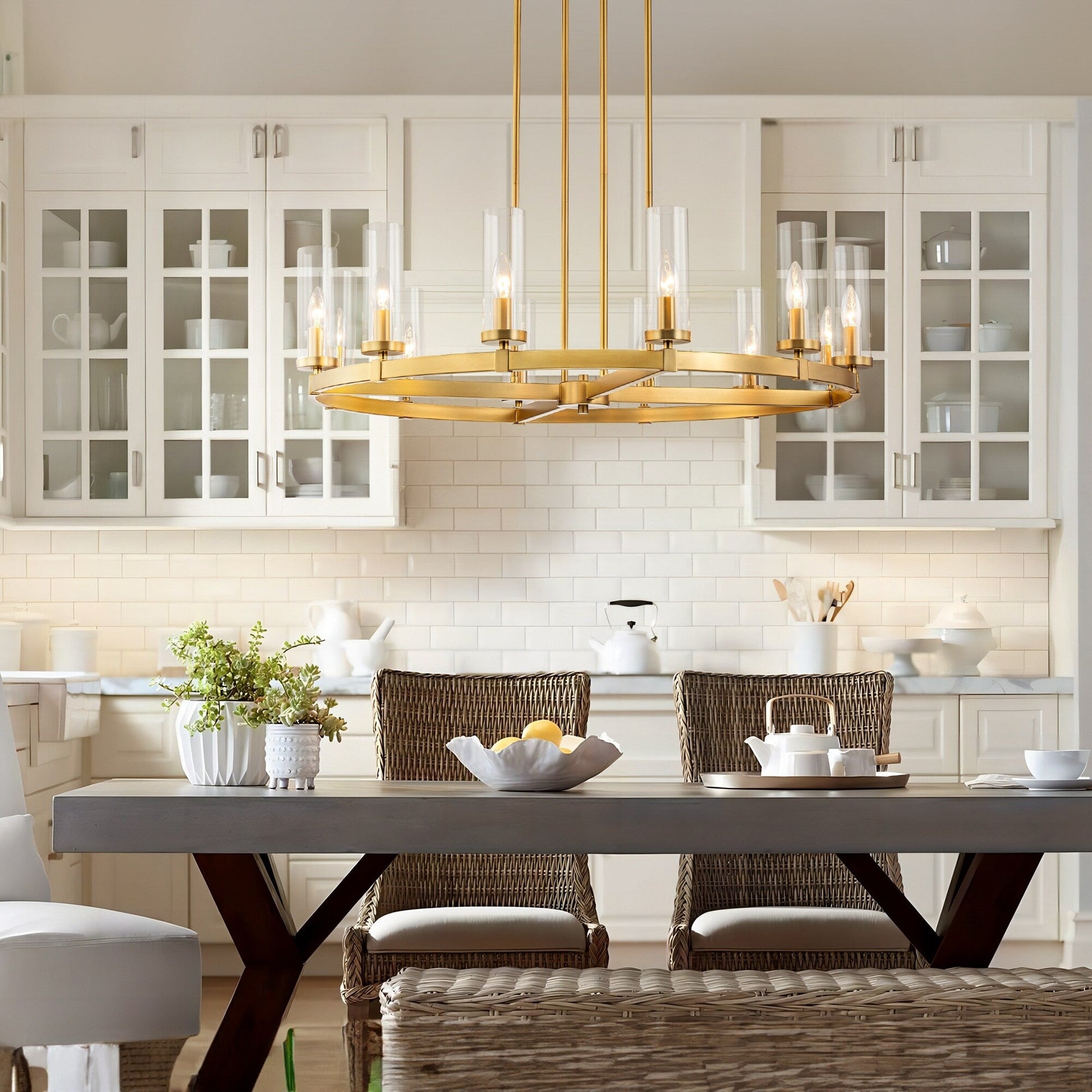 This 12-light retro industrial circle wagon wheel chandelier clear glass island light with a 35.4-inch diameter stands as a testament to unparalleled craftsmanship and design ingenuity. The lighting goes through the pure-clear glass shade and imparts a soft and ample illumination, casting a luminous aura that gracefully envelops your living space. Meanwhile, this opulent fixture showcases a distinctive wheel-shaped frame and elegantly cylinder candlestick-style bulbs (not included) design, exuding a commanding presence with a pronounced vintage industrial aesthetic.