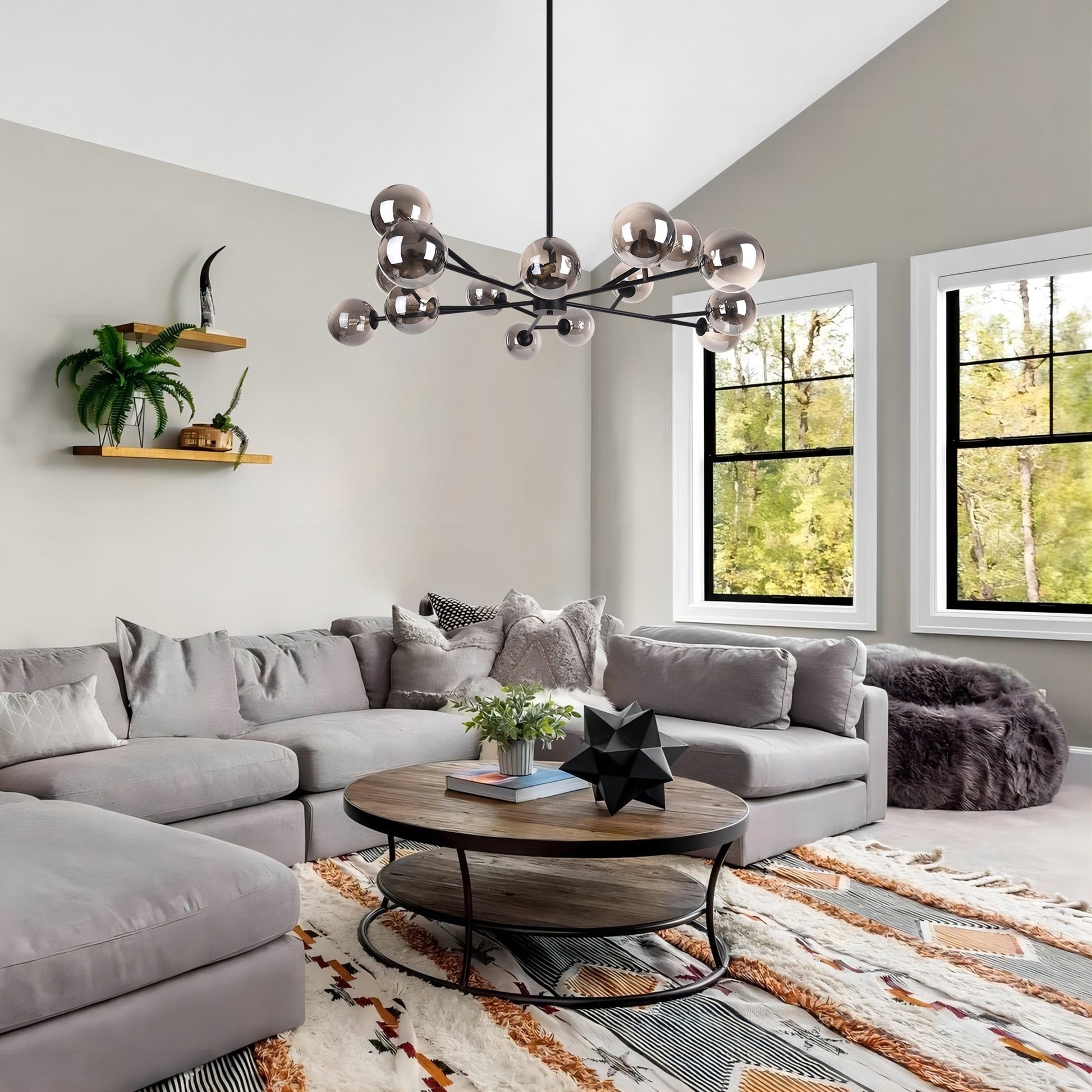 Make a statement in any room with this modern and stylish Sputnik cluster glass chandelier. The design is unique yet sophisticated, and the black smoked/ amber glass globe bubble shade ensures soft and ample lighting, making this branch cluster gold/ black chandelier light fixture a perfect choice for both functional and decorative lighting. Combining glass orbs bubble and metal tube framing creates a stunning effect.