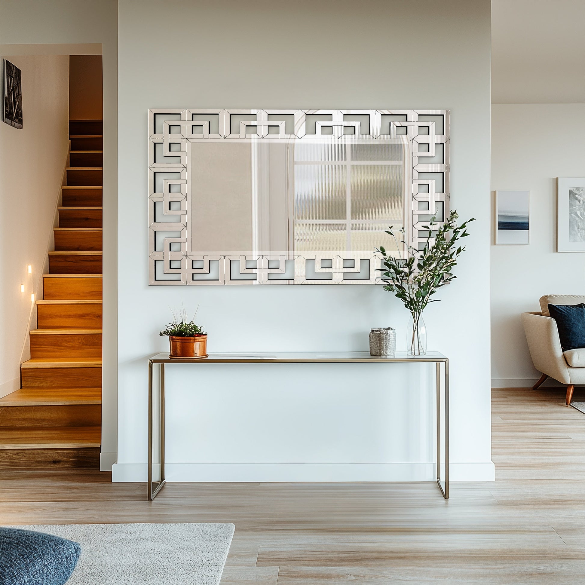 You can adorn any prominent wall with this dazzling contemporary mirror and be sure to catch people's attention.Showing openwork geometric details and smooth silver finishes, with an accent style. There is no better way to bring elegant design beauty to your home than this large wall mirror. Living room mirror will dazzle your guests and create a permanent personality for your living space. Perfect for contemporary and glam aesthetics,it showcases a rectangular mirror, which is set in a dazzling trellis-style border crafted from individual hand-beveled mirror segments. it looks stunning to set above your master bath vanity or entryway console. It can be hung horizontally or vertically.