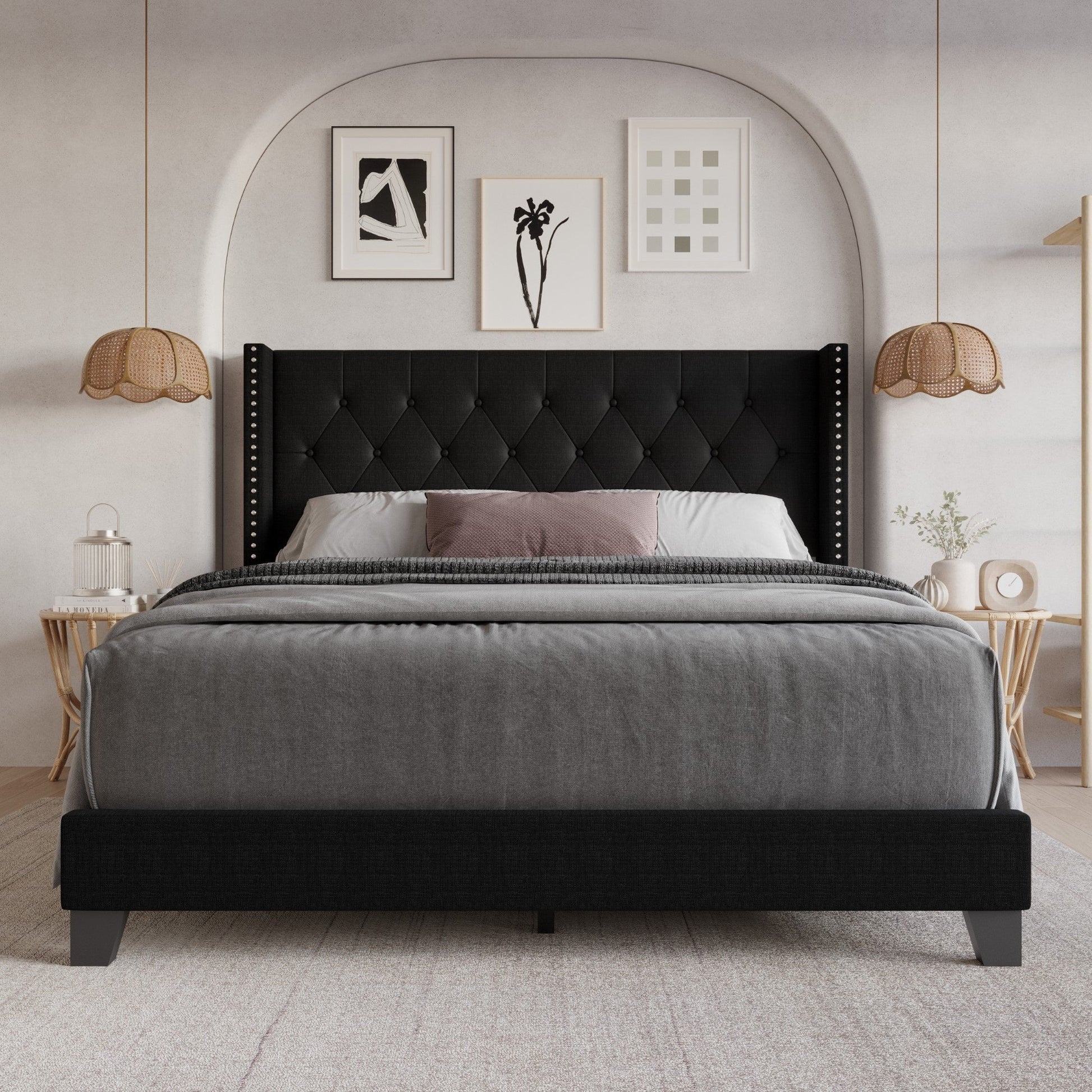 Enhance your bedroom style from plain and simple to modern and elegant, this bed makes it a perfect update to your space. This bed is fully wrapped in faux leather upholstery for a textured feel. Plus, it features a clean-lined wingback protruding side headboard with a classic button tufted and nailhead trim accent. Foam filling in the headboard is ideal for leaning up against while reading before bed and giving a softer aesthetic. Additionally, this bed has variety shades of colors and sizes to suit your needs.