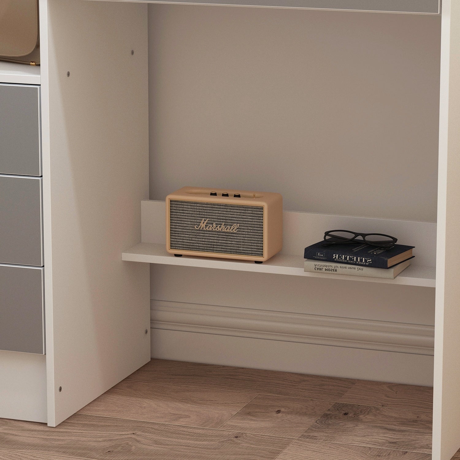 This dressing table and stool kit are designed with lockers for storing cosmetics. The dressing table and stool set are stylish and practical modern furniture in your home. The large makeup mirror, 4 drawers storage cabinets can provide ample storage space for your cosmetics, perfumes, lotions, nail polish, hair accessories, etc. The padded stool is stable and comfortable to sit on.