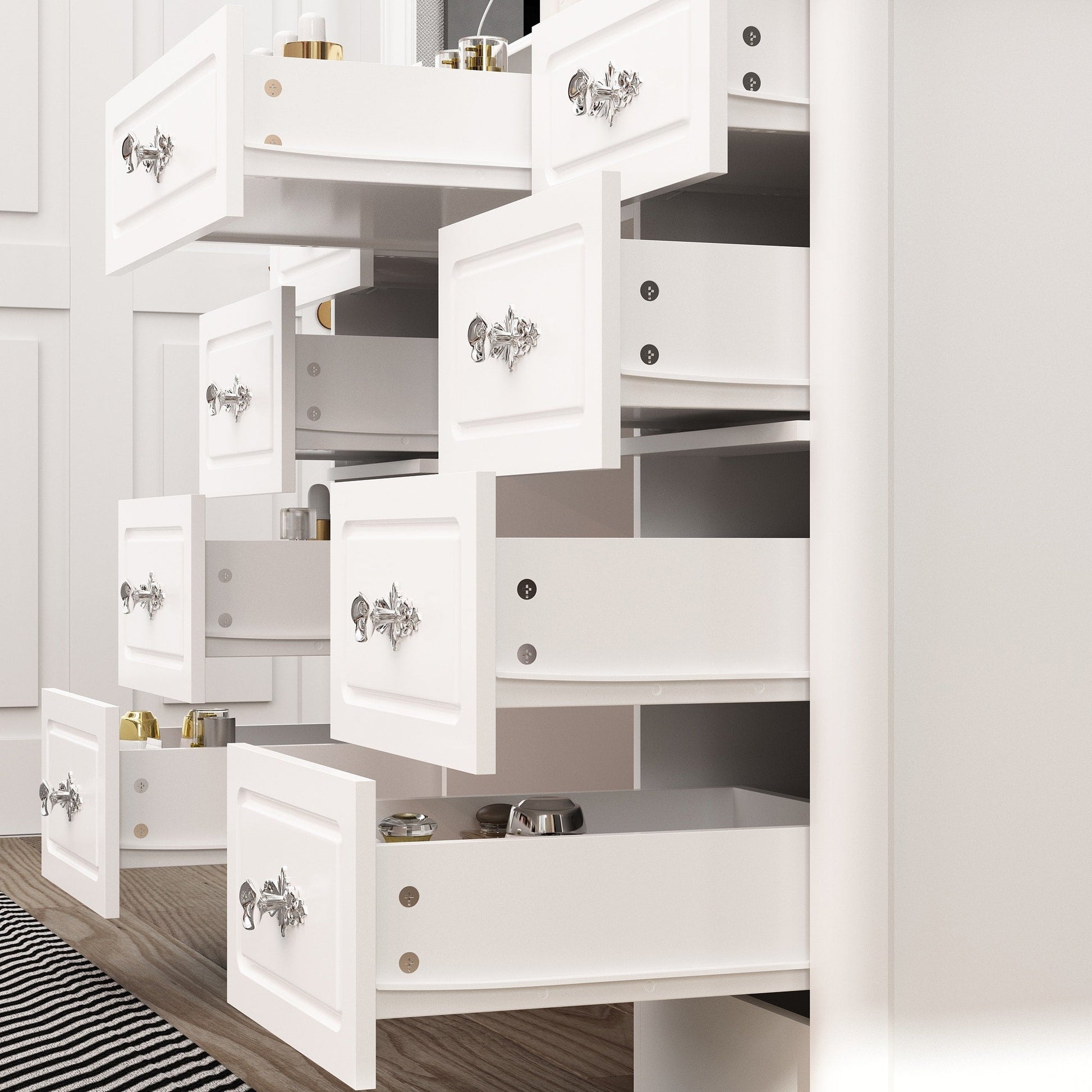 Drawer Design: The drawers are equipped with 14-inch white silent undermount slides for smooth and quiet operation.