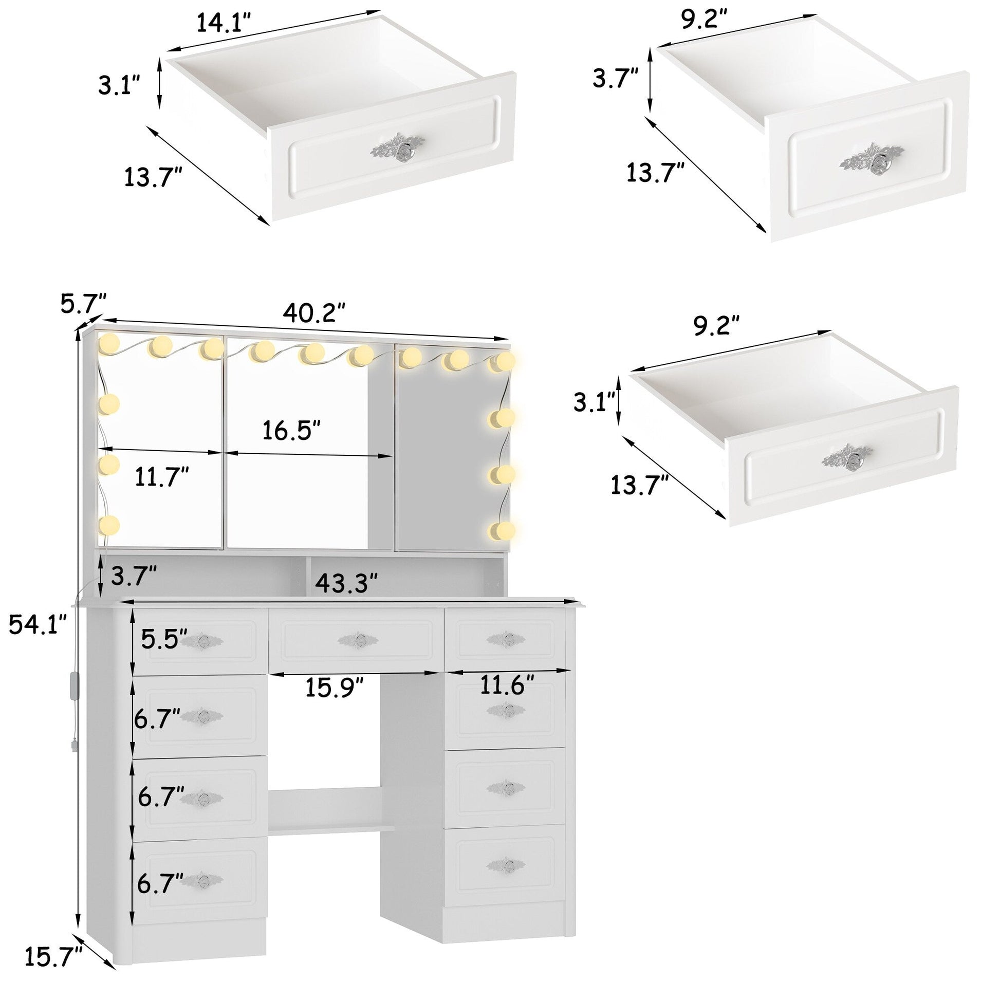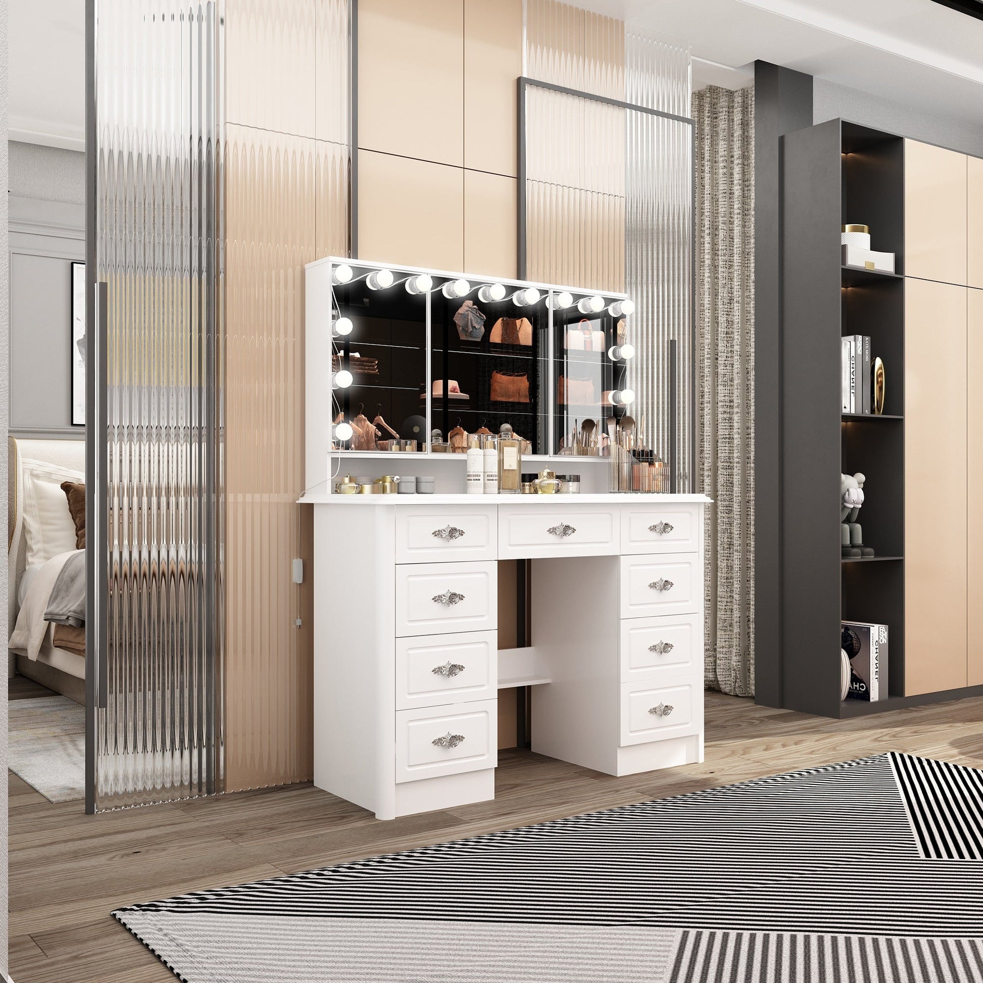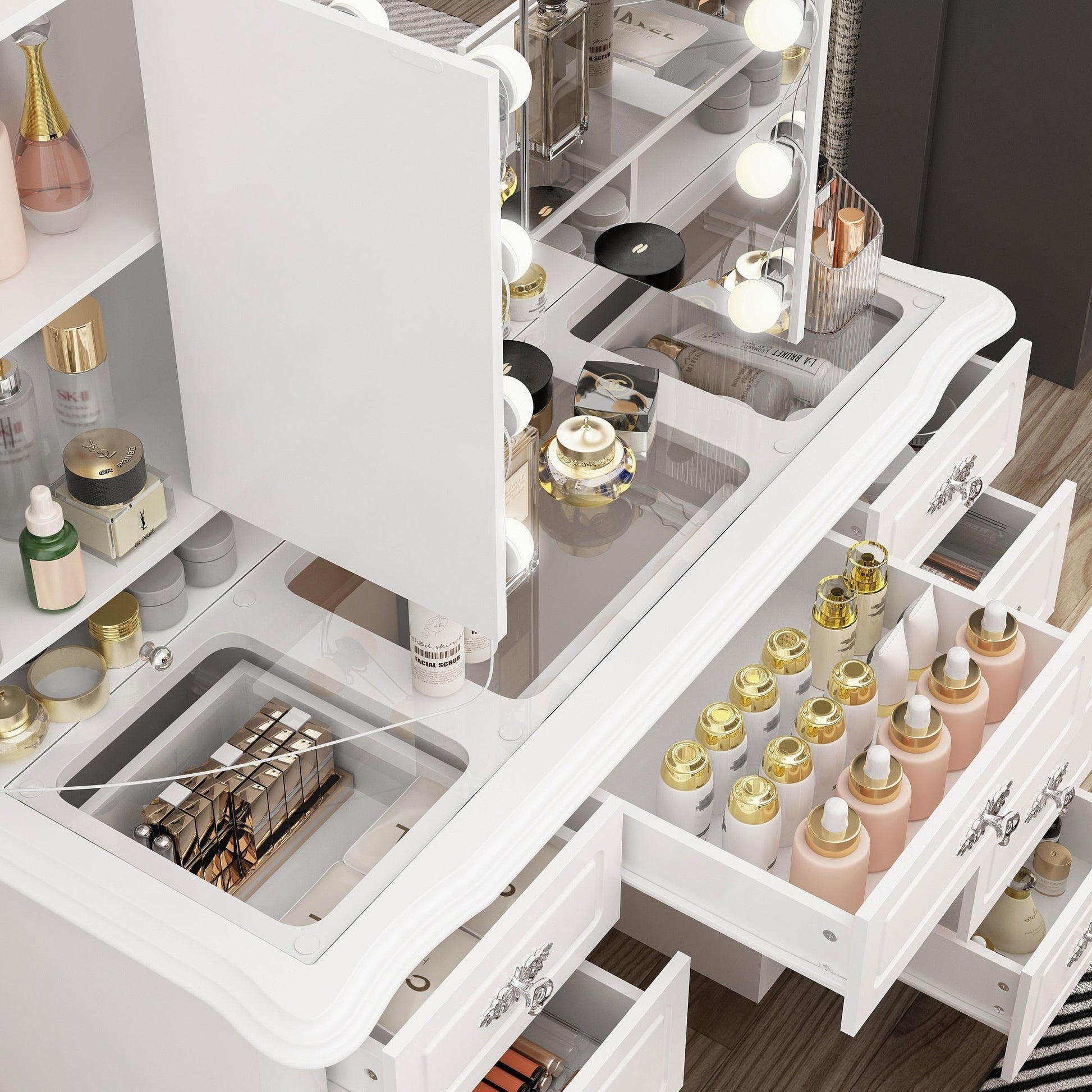 Revolutionize your beauty space with this meticulously crafted makeup vanity. The white color palette exudes purity, while the silver rose gold accents add a hint of glamour. The tri-fold mirror, adorned with adjustable lighting, transforms your beauty routine into a daily indulgence. The thoughtful design, including silent drawers and USB convenience, makes this vanity a practical and stylish addition to your space.