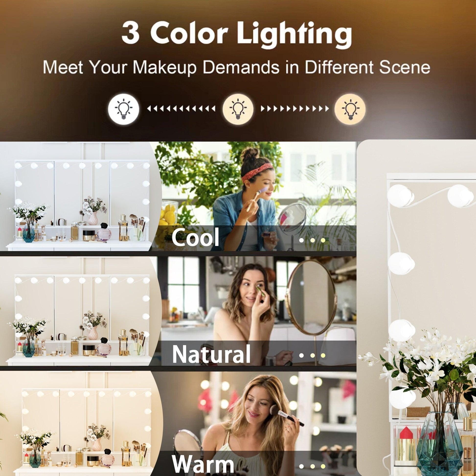 Tri-Fold Mirror: Enjoy the convenience of a tri-fold mirror featuring a ring of three-color bulbs (Warm Light, Daylight, Cool Light). Illuminate your vanity space with a set of 15 certified bulbs, each with 0.5W power. The USB interface provides convenience without the need for a power adapter.