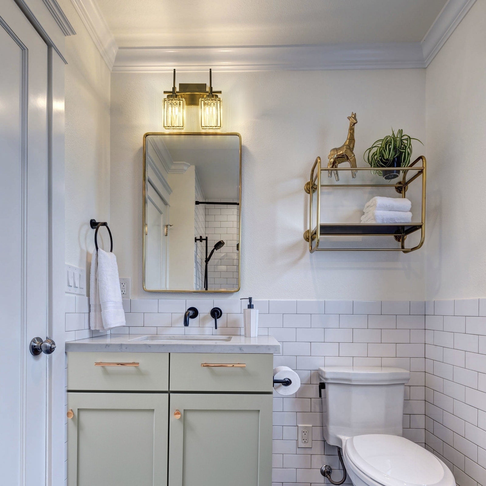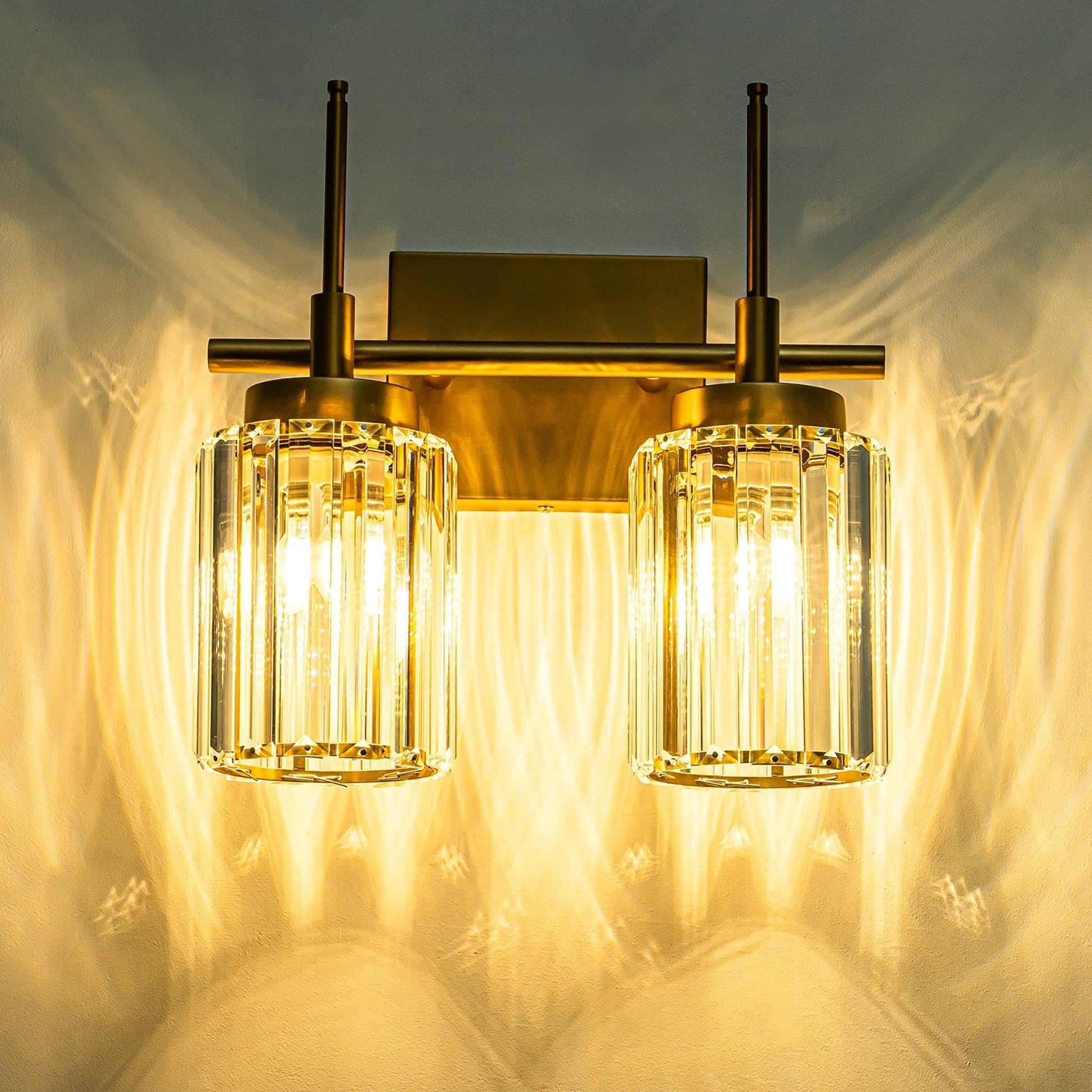 Elevating the elegance and refinement of your bathroom's decor with our glam crystal bathroom vanity light.This brushed brass bathroom vanity light features a sturdy metal frame and a precisely-cut crystal shade to ensure its durability and timeless appeal, promising to elevate the opulence and refinement of your room's aesthetic. Premium crystal shades hang below a gold linear metal rod rounds out the elegance look. Each cylinder crystal shade conceals a charming spectrum of rainbow hues, captivating the eye even in natural daylight and serving as a captivating focal point for your bathroom or dressing area mirror.