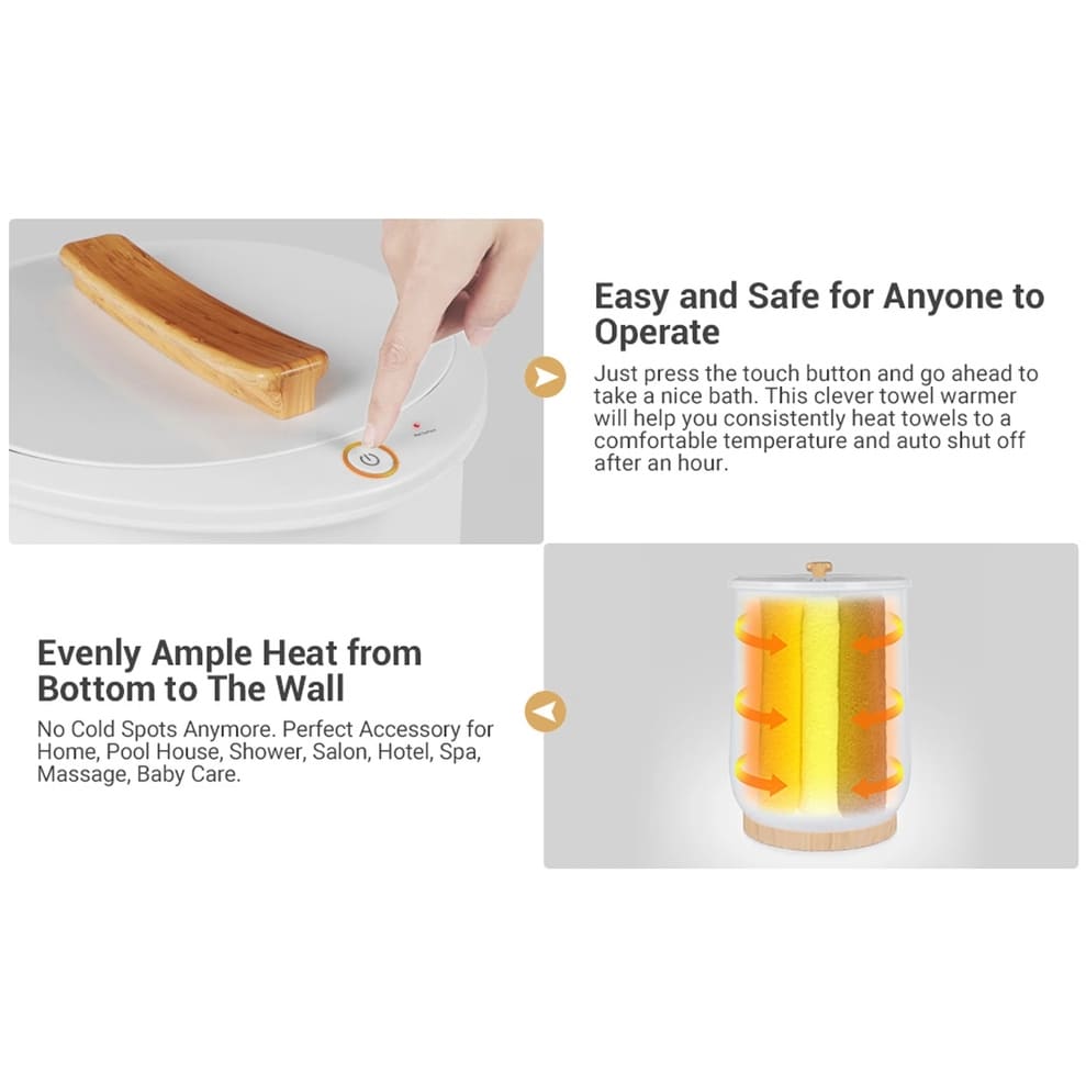 • 【1-Minute Rapid Heating】Super simple operation. Just put your dry towels in and press the one single sensitive touch button control before bathing. After 1 MINUTE, the towels will get quick heat. After 6 MINUTES, the temperature will up to 122℉and will continue up to about 266℉and keep the warm in an hour. This towel warmer will shut off automatically for safety after an hour. After bathing, you can use the warm towel immediately, enjoying the comfortable spa experience at home!
