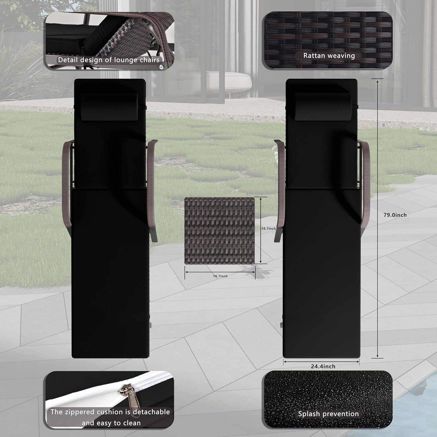 Kullavik patio chaise lounge includes 2 lounge loungers and 1 small wicker table. All three pieces of the set are ready to fold and easy to carry. Using all-weather PE rattan and outdoor rust-resistant metal, this bistro set is premium waterproof as well as sturdy and durable. The cushions of the set are removable and washable. This 3 piece lounge chair set is perfect for patio, garden, poolside.