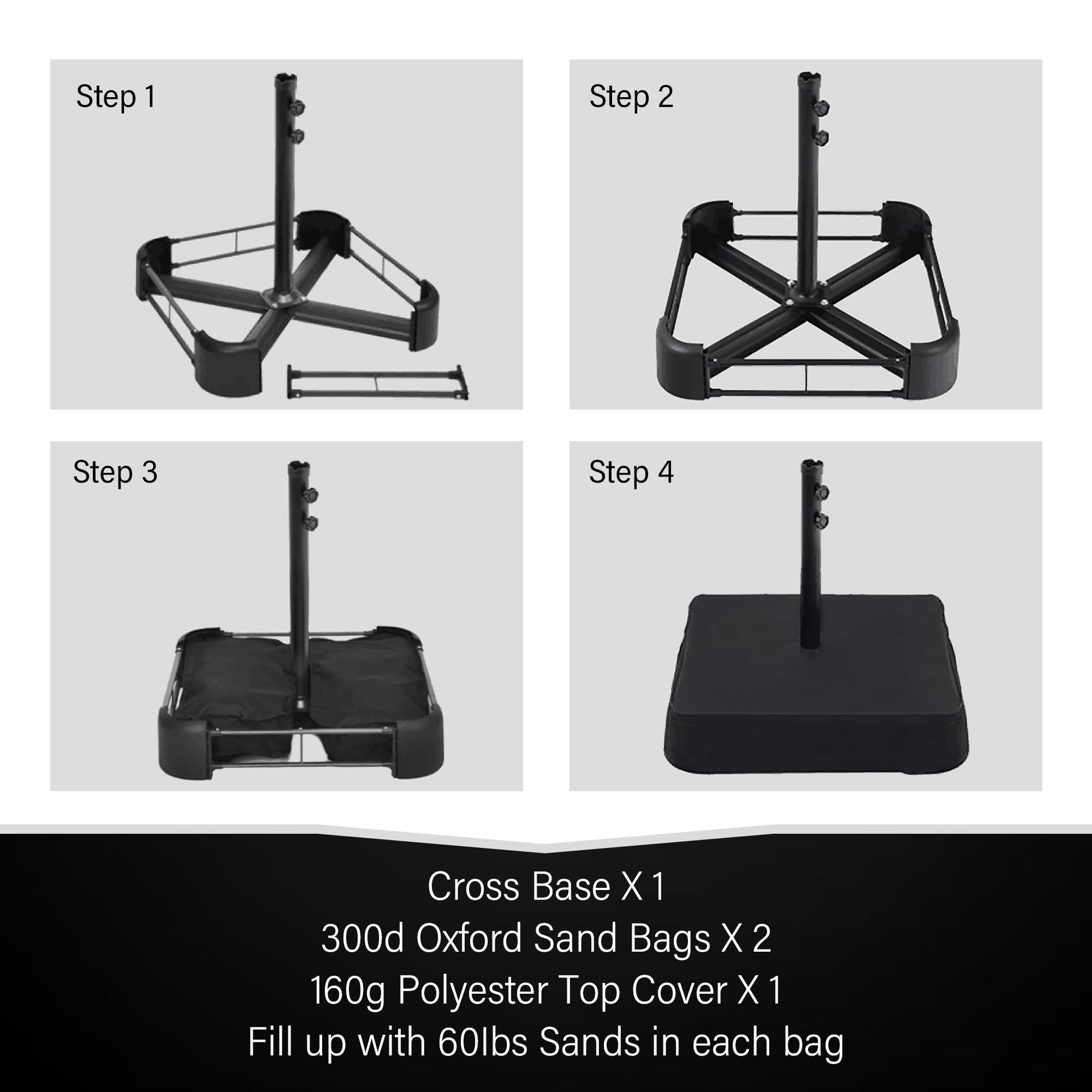 - Umbrella Base Included for Easy Setup: Comes with a sturdy steel cross base along with two durable sandbags made of 300D Oxford fabric and one top cover from 180G polyester fabric. We recommend using 100 lbs of sand for each bag to ensure stability.