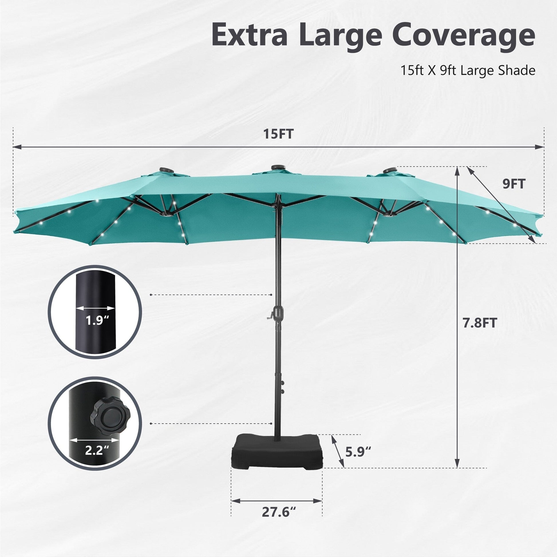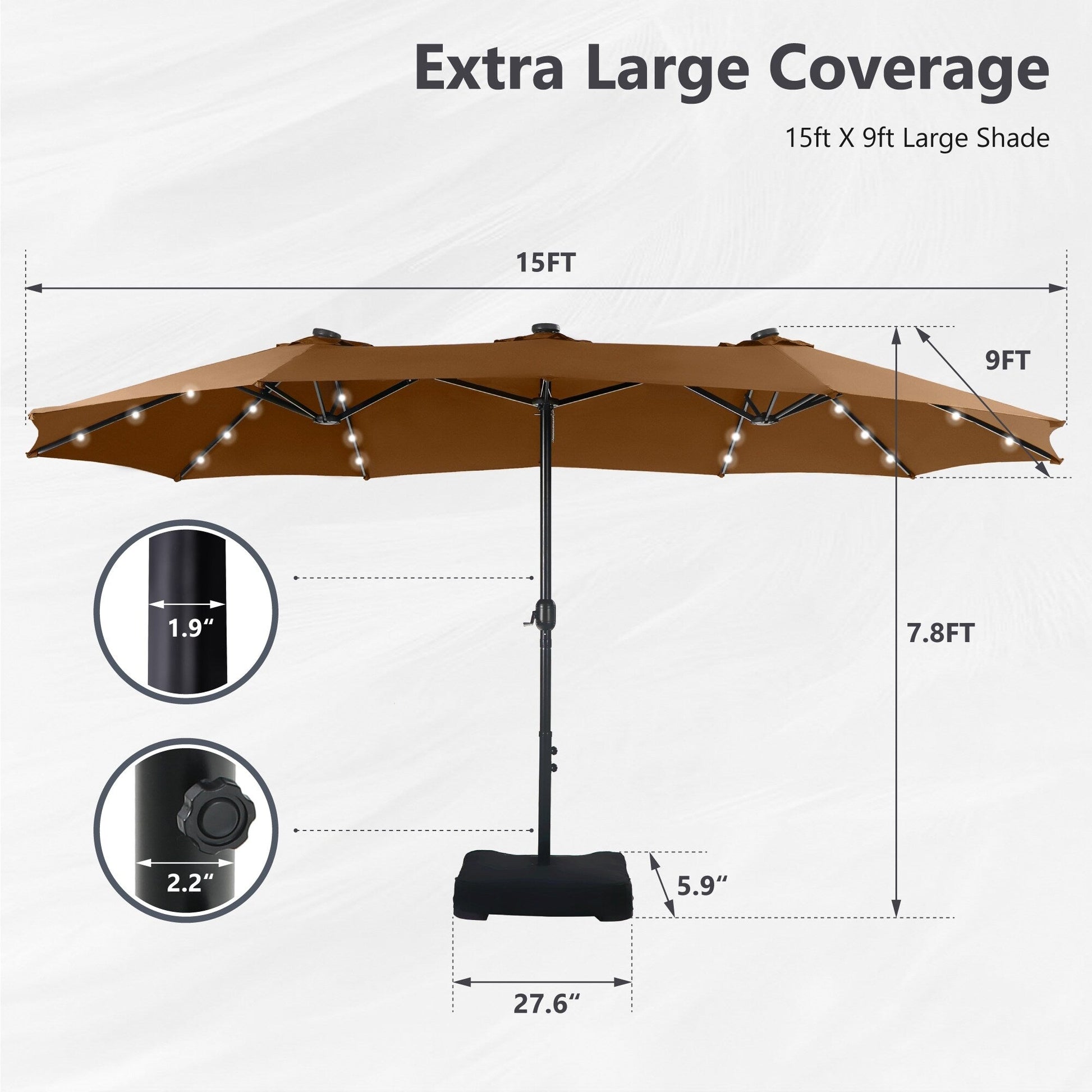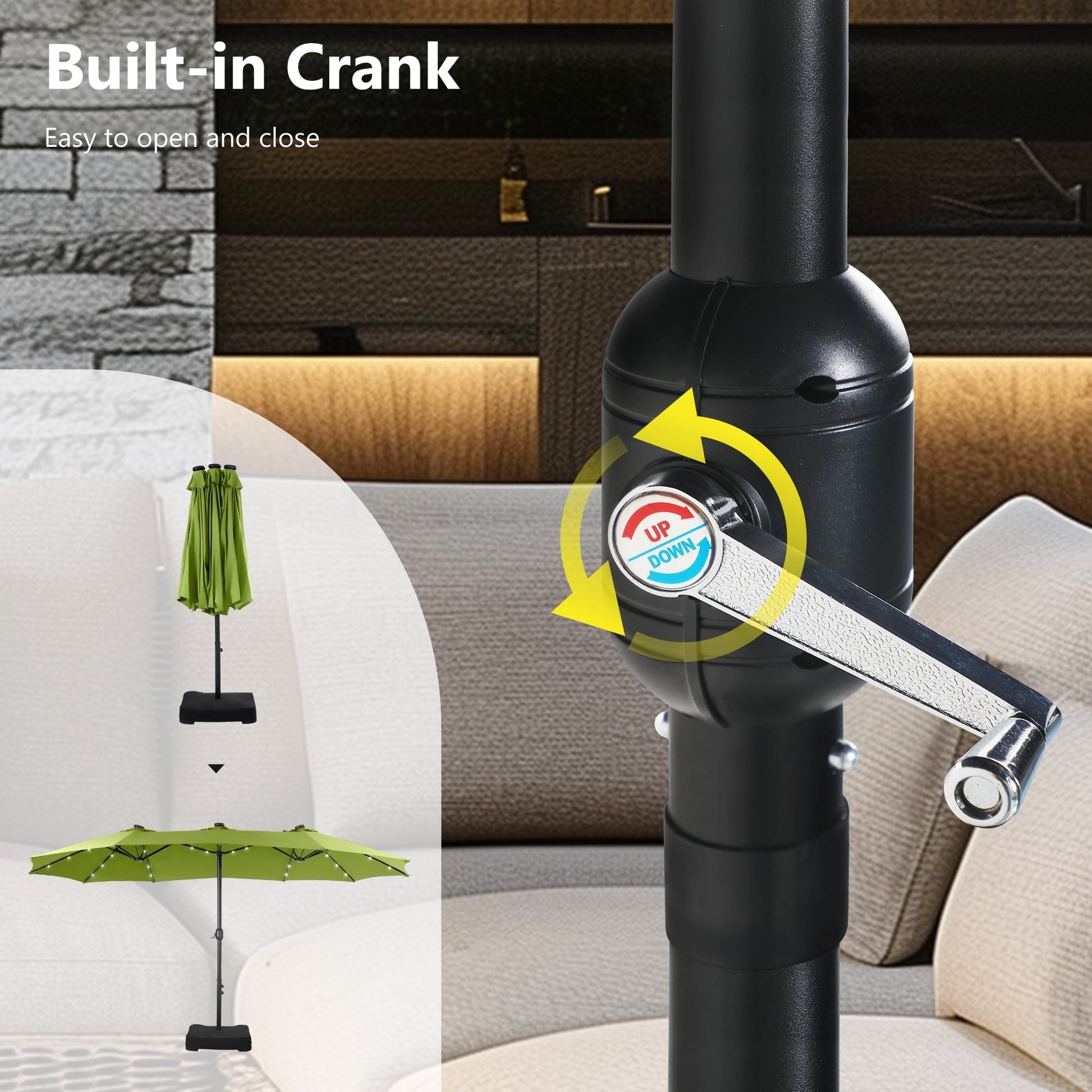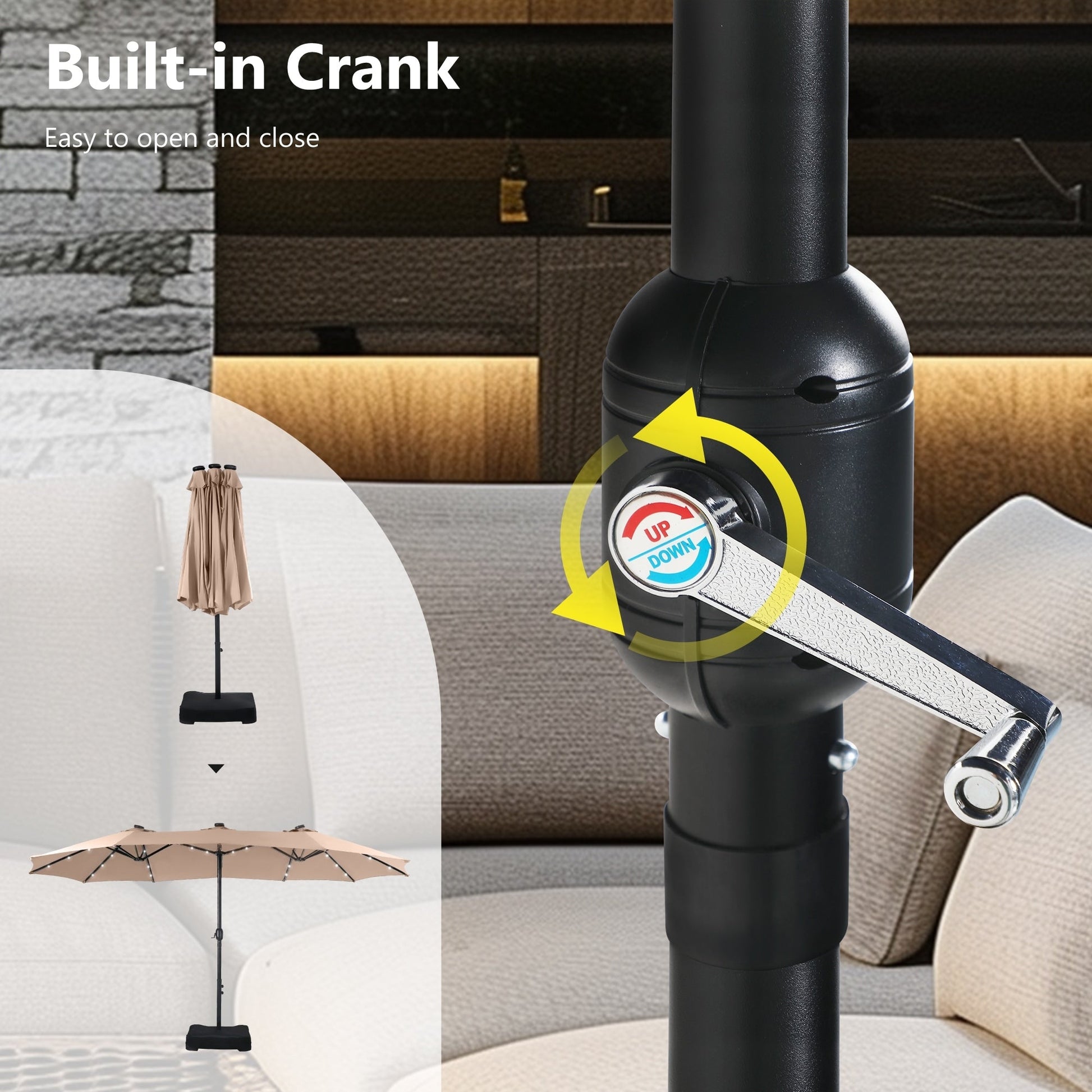 MAISON ARTS 15-foot Rectangular Crank Double-sided Outdoor Market Umbrella Solar LED Lighted Patio Umbrella with Base Included