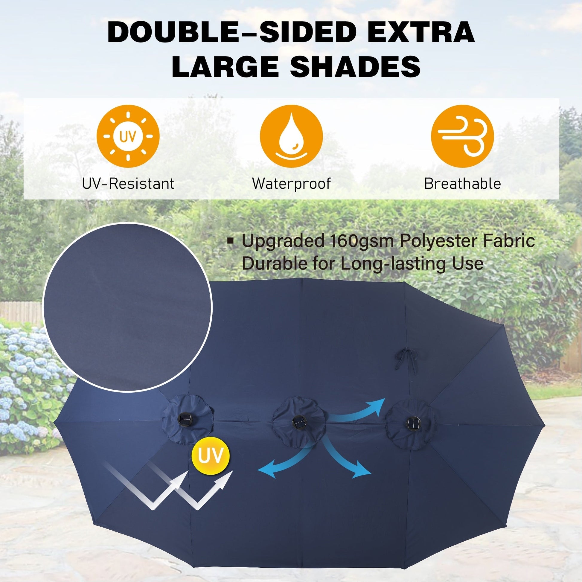 Transform your outdoor area with this stunning 15ft Double-Sided Patio Umbrella. Enjoy effortless opening and closing with the user-friendly crank lift that works in just 5 seconds. The beautiful canopy is made from 100% polyester, ensuring it is waterproof, fade-resistant, and UV-protected, providing you with breathable comfort in any weather. Plus, it comes with 36 LED lights (3 on each rib) powered by 3 solar panels, creating a cozy atmosphere with an automatic charging system for your convenience.