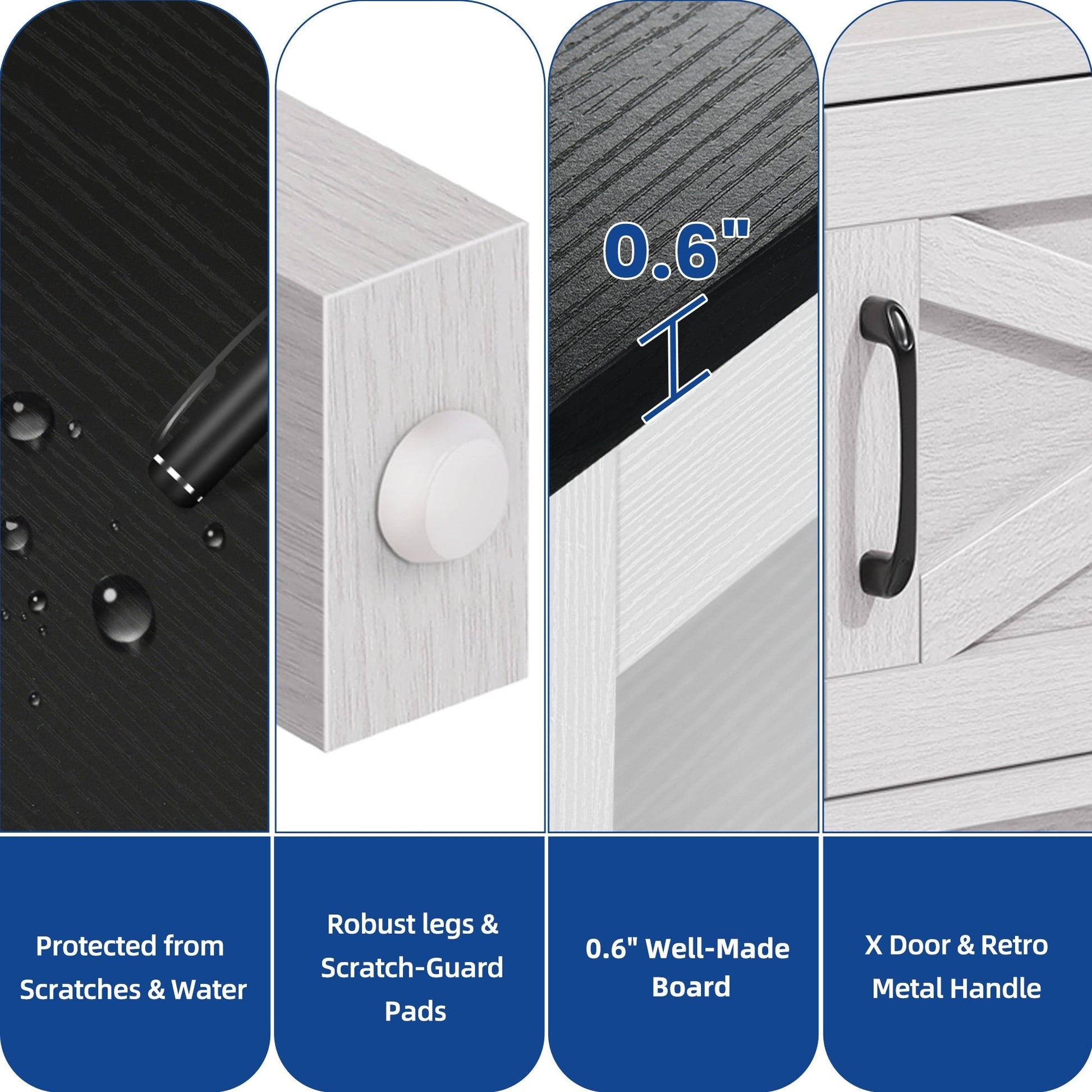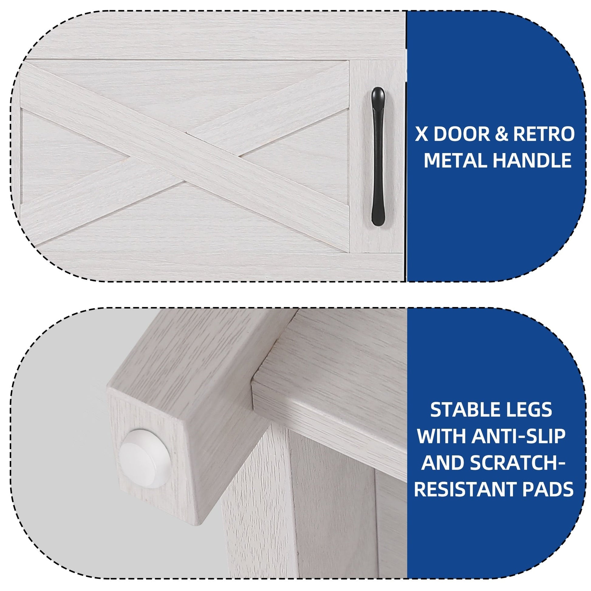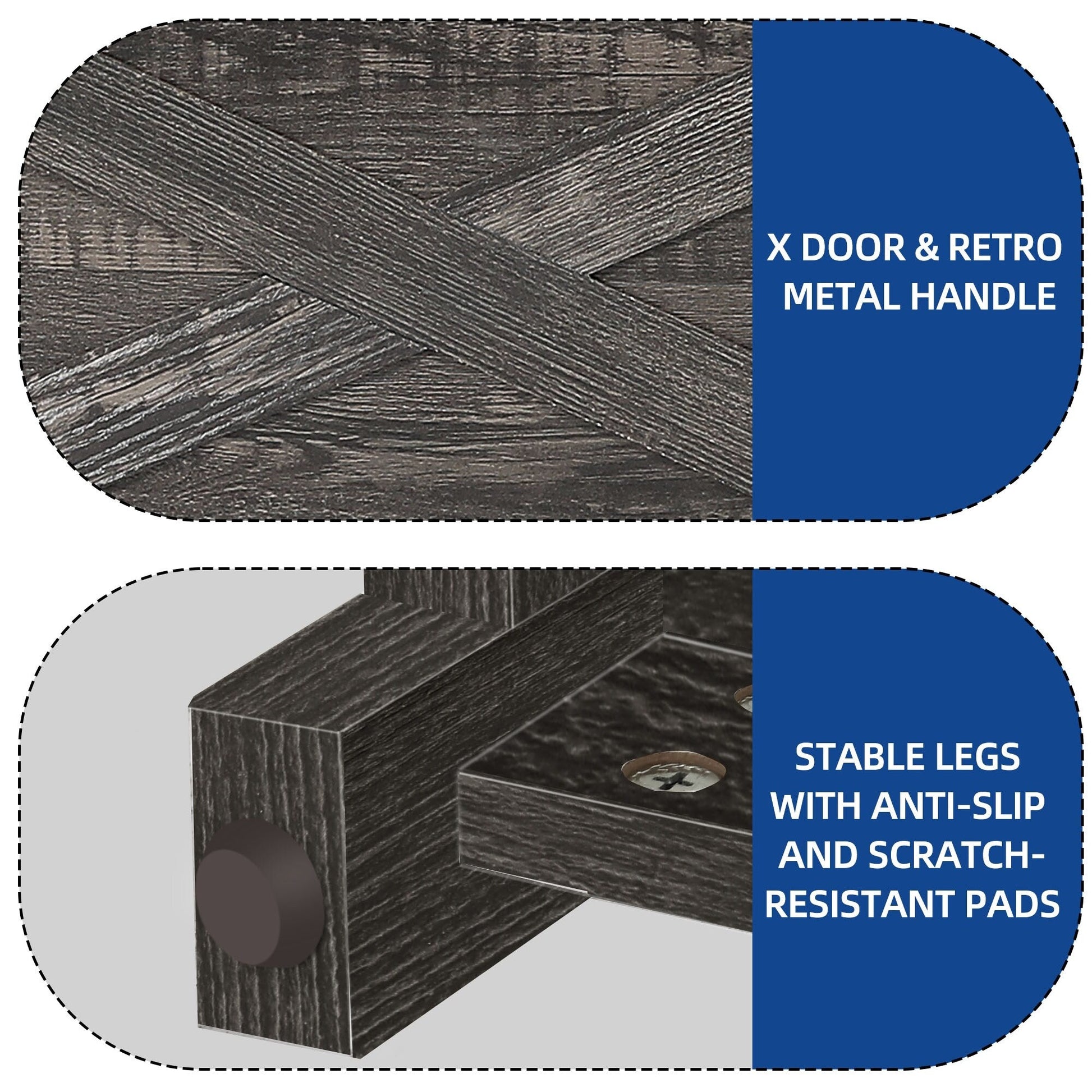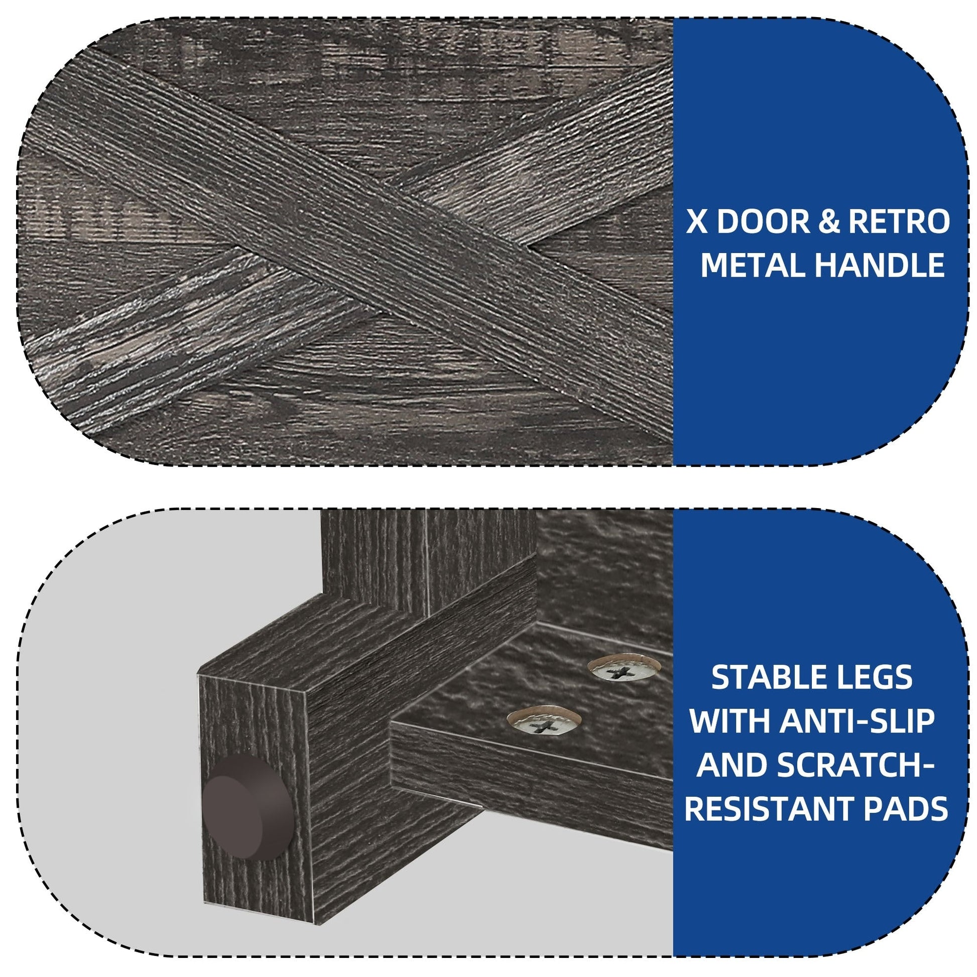 • 1. Double X Design: Classic X design on both sides upgraded the decoration style. Easy steel bar handles hinge doors put things in and out conveniently without wobbling or scraping