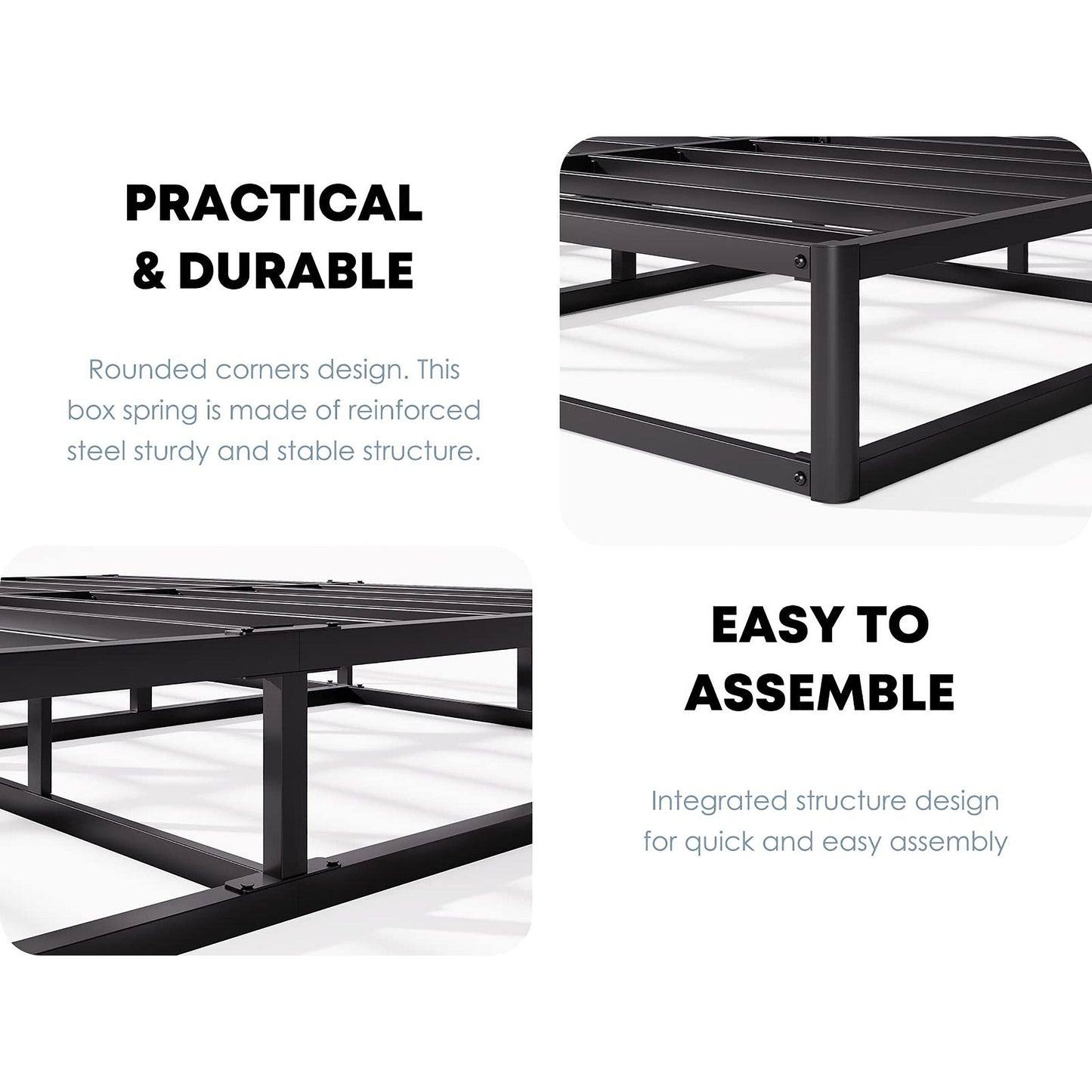 • Exceptional Support & Longevity:Sturdy metal slats combined with a reinforced steel structure enhance durability, supporting up to 800 lbs for single-size and 1500 lbs for double-size box springs. This foundation not only protects your mattress but also extends its lifespan.