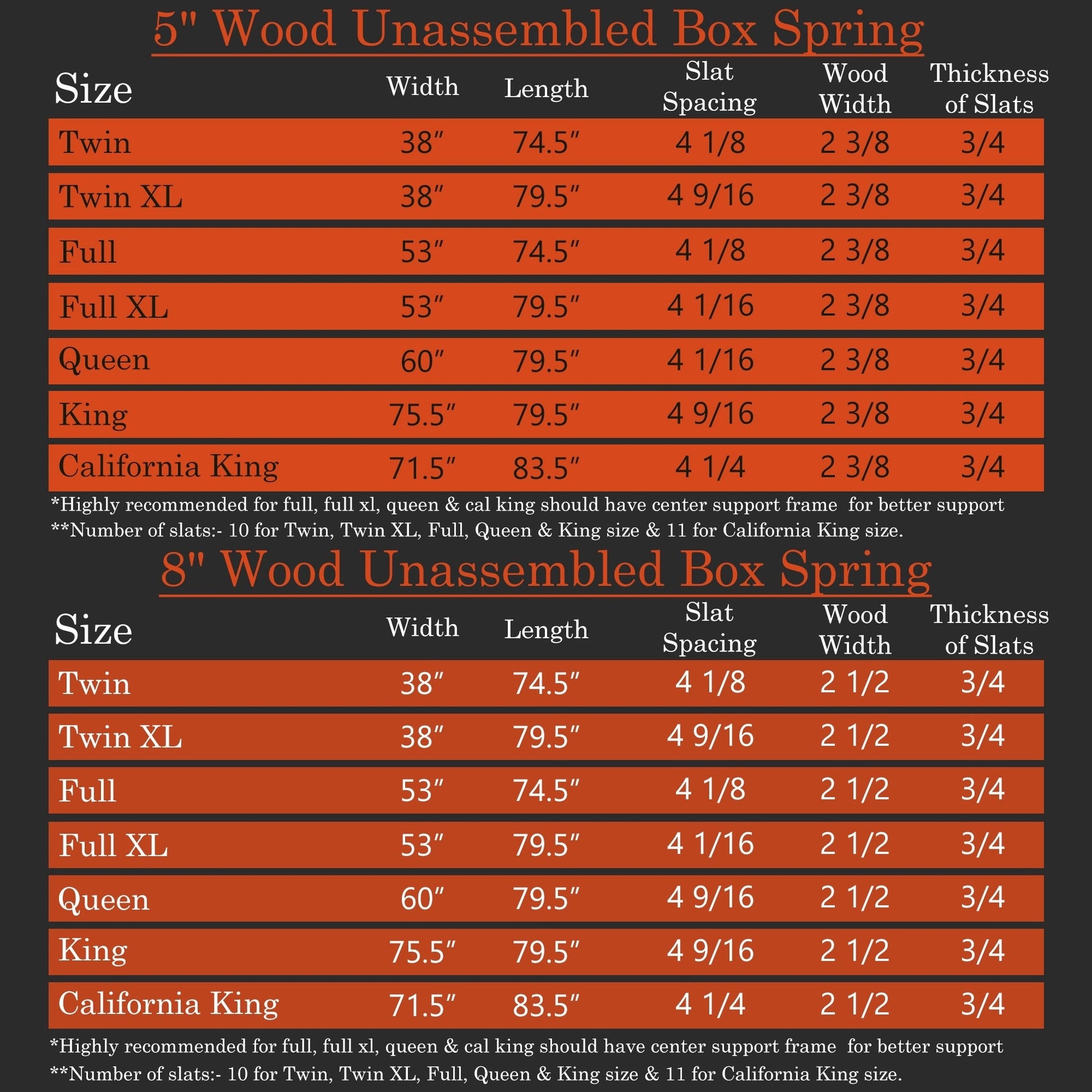 Introducing the Onetan Easy Wood Box Spring/Foundation with Simple Assembly, the perfect way to support your favorite mattress while giving it the love it deserves. Crafted using lightweight but dense lumber, this sturdy design can handle even the heaviest of mattresses without creating annoying squeaks. The traditional box spring design has equally distant wooden slats, providing balanced support. With an assortment of sizes available, including Twin, Twin-XL, Full, Full XL, Queen, King and California King, you can create your ideal sleeping environment at a height of 5” or 8” in a beautiful White color. Setting up this economic foundation is quick and easy, with tools and an instruction manual included for your convenience.