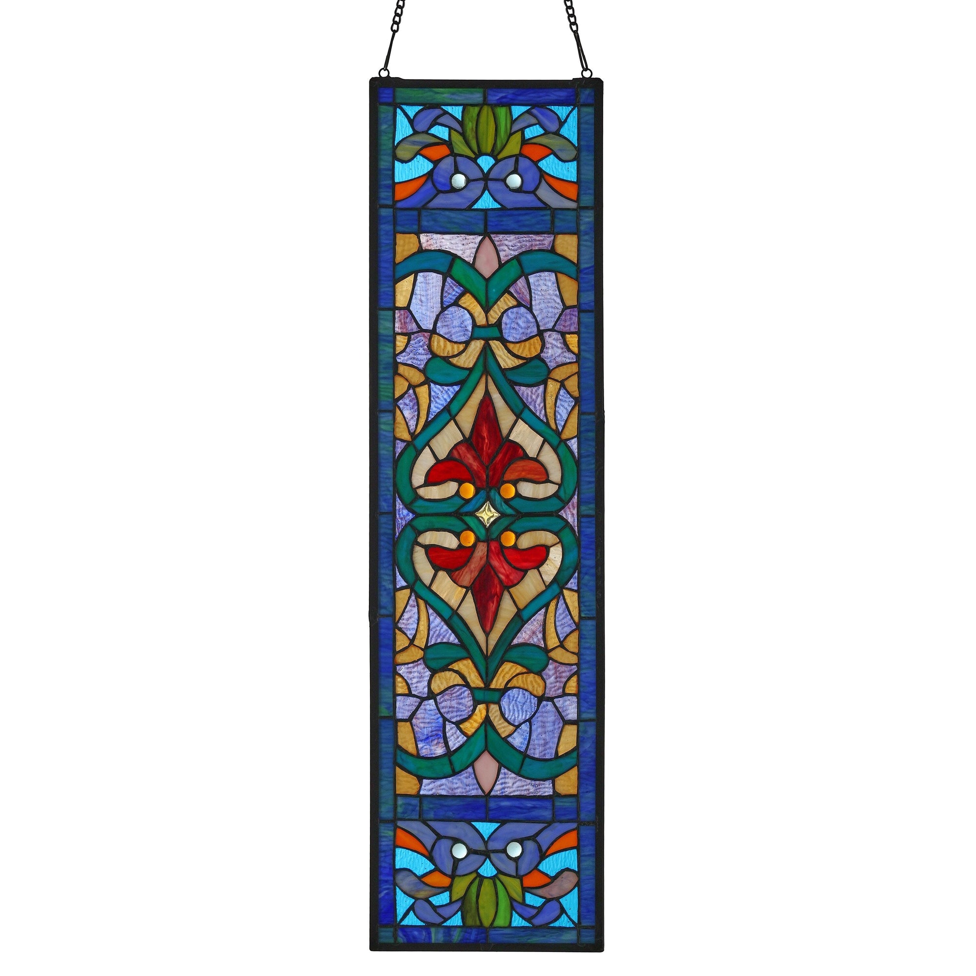 Add privacy and beauty to your home with this Victorian-style stained glass window panel from River of Goods. The exquisite Fleur De Lis design is handcrafted with brilliant blue, teal, and red colors that catch the sun's rays and reflect light throughout any room. This panel comes with a decorative hanging chain for easy installation and can be displayed as a sun catcher, wall hanging, or next to your front door. Delight your loved ones with this stunning glass panel that adds warmth and happiness to any living space.